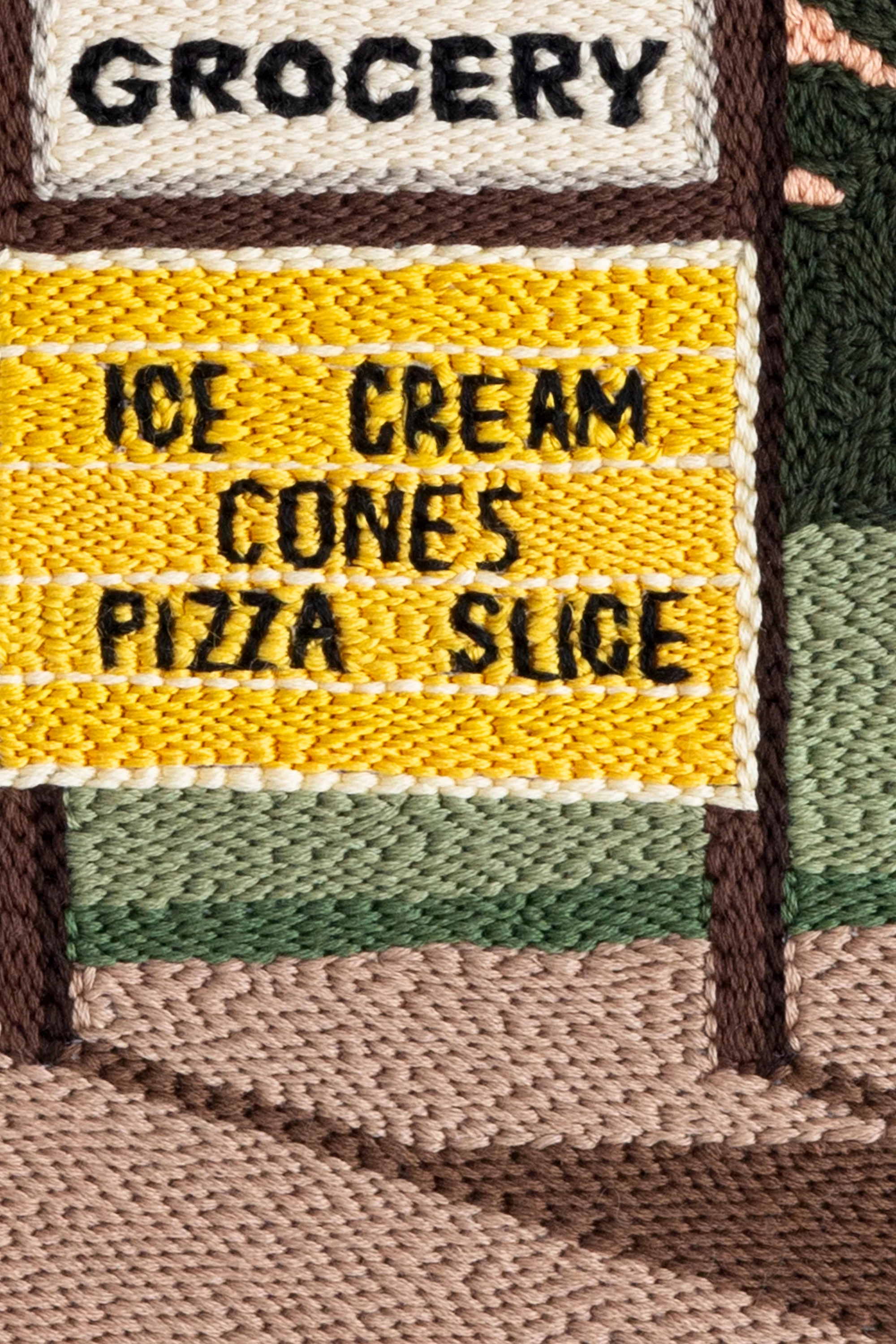 Each piece in The Scenic Route conjures memories of summer road trips, rendered in vivid colored threads. A pit stop for a roadside snack, a glance at the horizon as the sun dips at dusk, or the soft glow of a neon sign against the fading day all evoke these in-between moments — the ones that linger long after the summer ends. This is the world Adrienna invites you into.