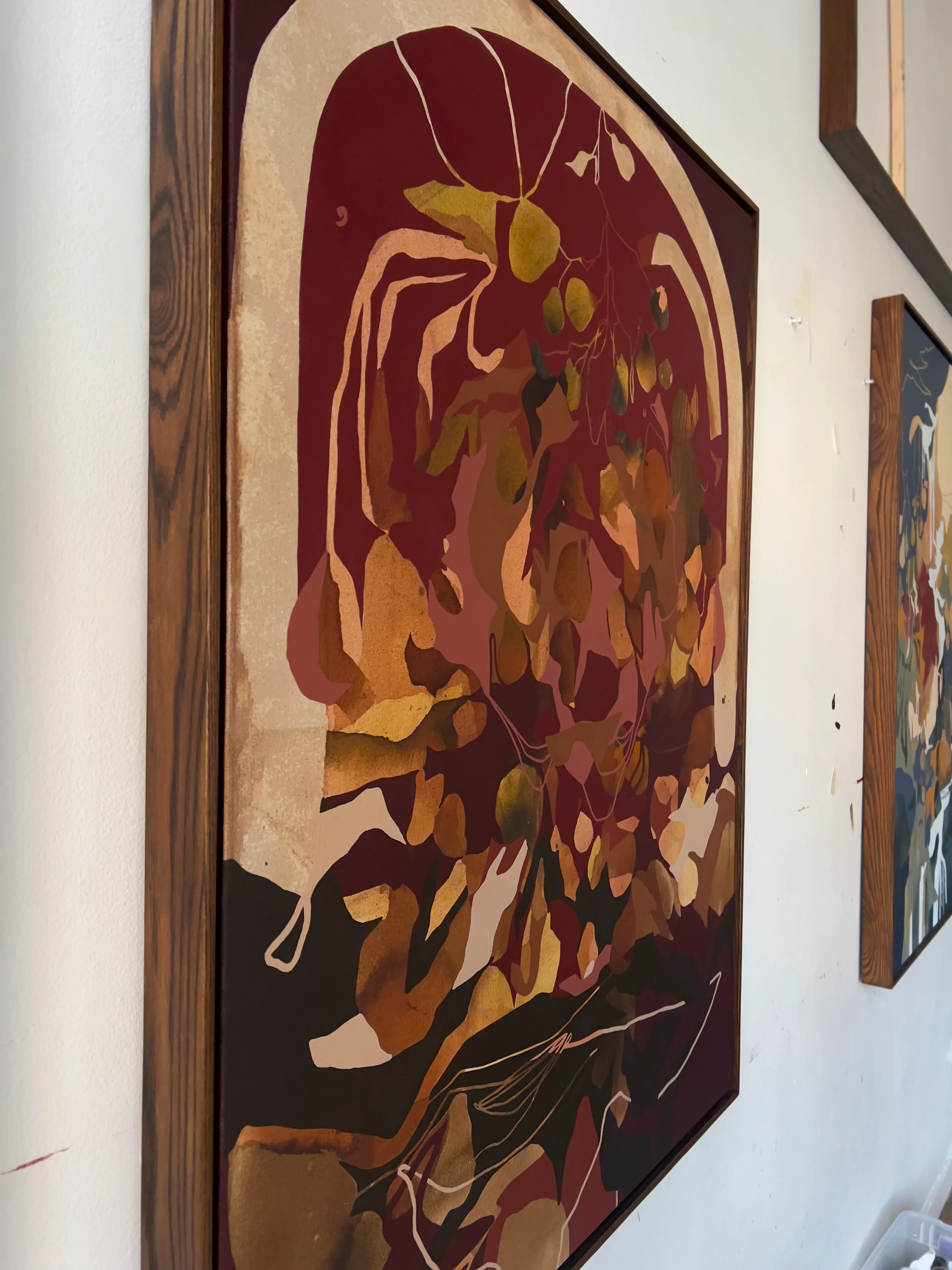 Amelia Valentine is a Toronto-based painter living and working in the city’s west end. Her practice centers around the dialogue between control and spontaneity, using ink, acrylic, and raw canvas to explore what happens when intention loosens its grip. Her compositions are shaped as much by deliberate mark-making as they are by the unexpected — spills, splatters, bleeds, and other so-called accidents that challenge traditional ideas of mastery and authorship.