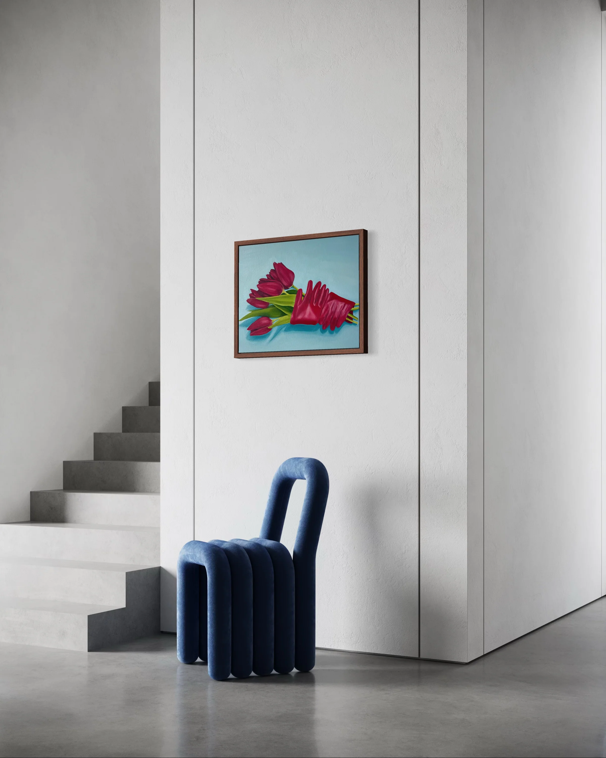 Together, the works give feeling and form to what may otherwise go unnoticed. Across the works, women and their proximate objects; tulips, gloves, reflective vessels, table settings, mirrored surfaces form a web of subtle gestures and emotional cues. The objects act as extensions of the women themselves: the pair of gloves become a surrogate embrace; tulips slump with fatigue; and reflections fracture or multiply the self, suggesting inner tensions that rest beneath a smooth exterior.