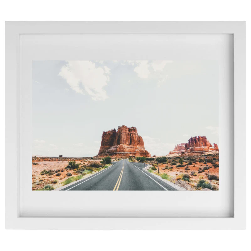 A collection of photography prints showcasing distinct monuments across the globe. This piece captures the red rocks in Moab, Utah via an open road to symbolize endless inspiration, opportunities, and experiences. By Ottawa-based photographer, Shannon Hawn.